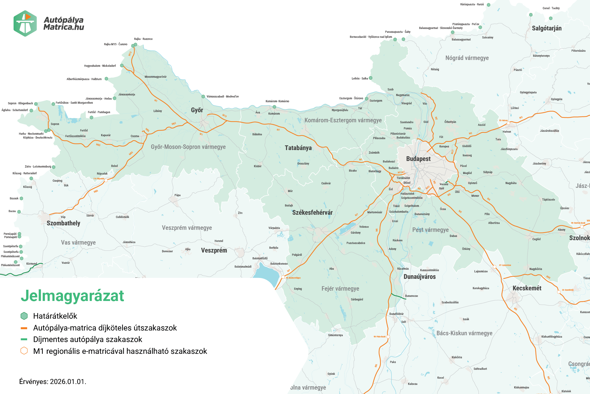 Érvényes Pest, Fejér, Komárom-Esztergom és Győr-Moson-Sopron vármegyék összes fizetős útszakaszára, a szomszédos vármegyék első csomópontjáig